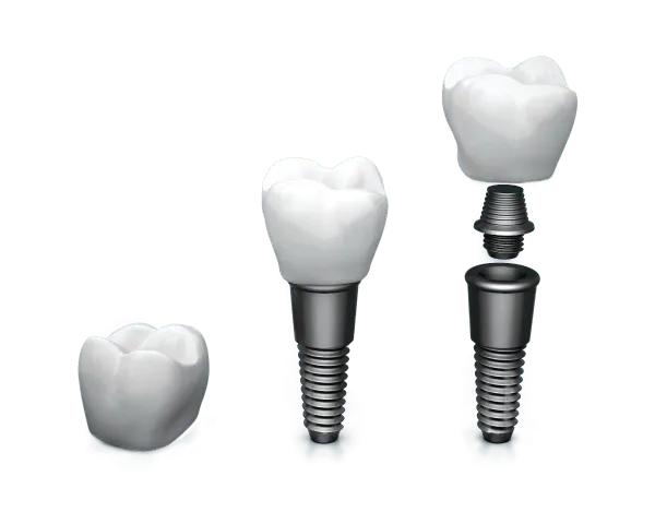 Dental implants have three parts to them. The first part is the titanium post. Titanium is used in the post because the human body does not reject this metal. Instead, bone builds up over the implant, a process known as "osseointegration." The titanium post is attached to the abutment, which is considered a connector component. This abutment attaches the post to the final part of the implant, which is called the restoration (or the "crown").